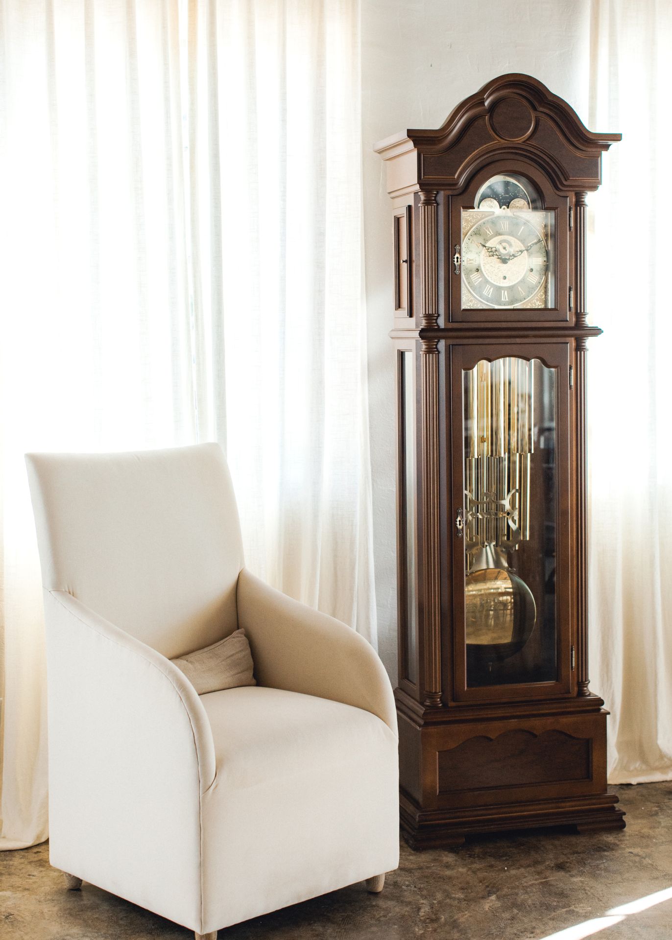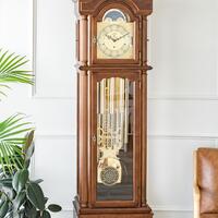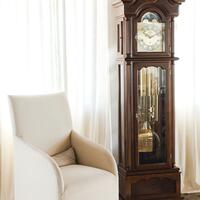 Klasični stojeći sat s kućištem od masivnog drveta. Ovaj model ima brojčanik izrađen od polirane mjedi s mjesečevom mijenom i poliranim njihalom od mesinga.