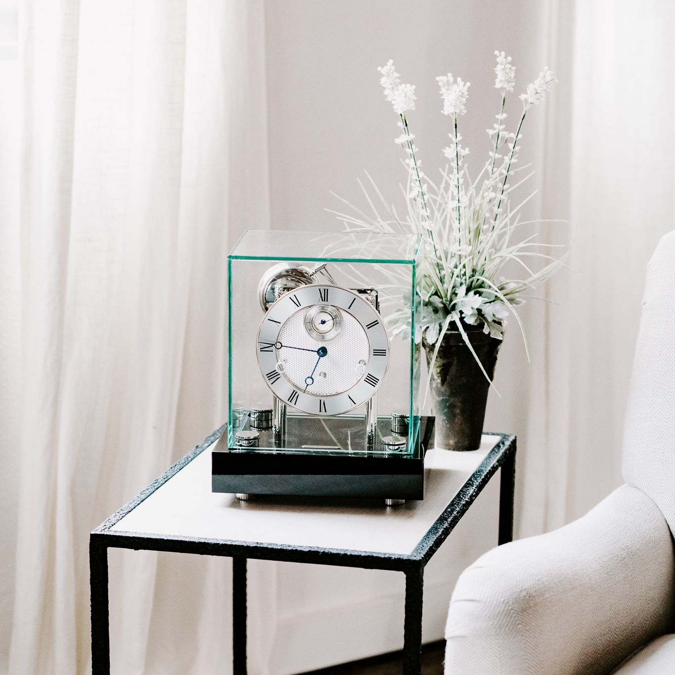 Minimalistički mehanički stolni sat s kućištem od masivnog drveta i stakla.