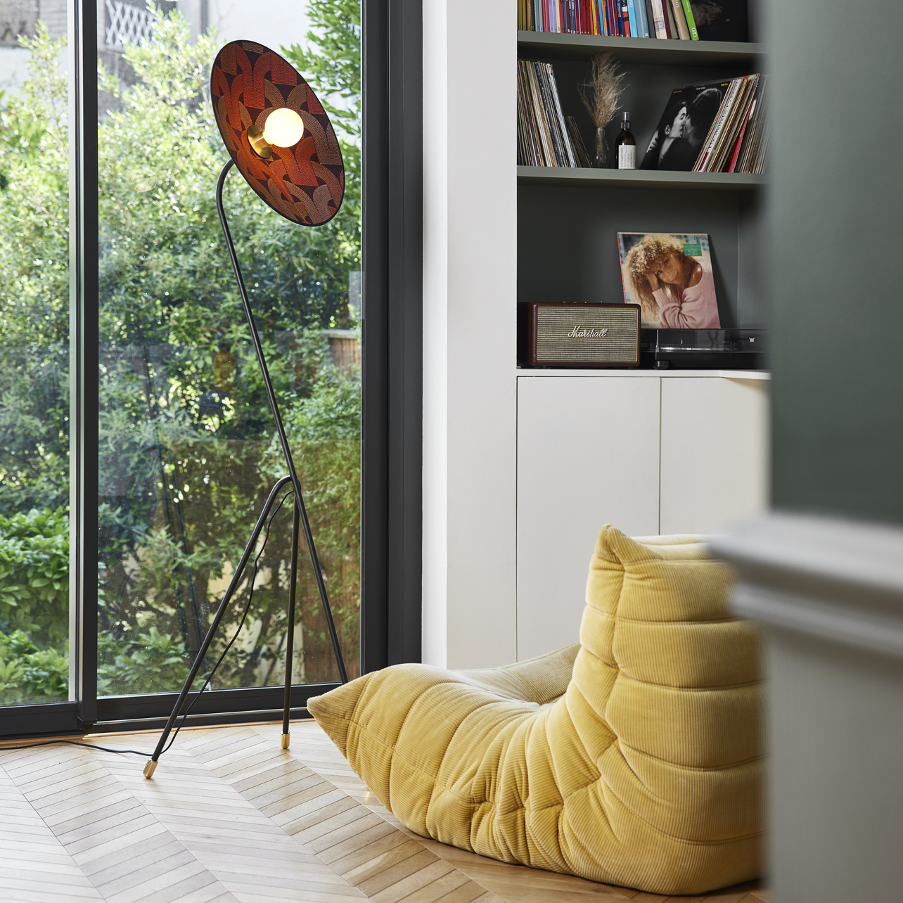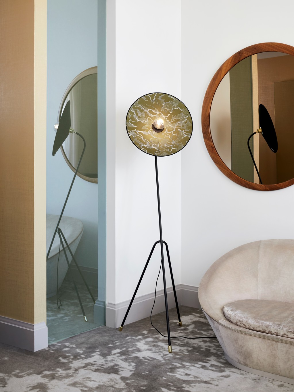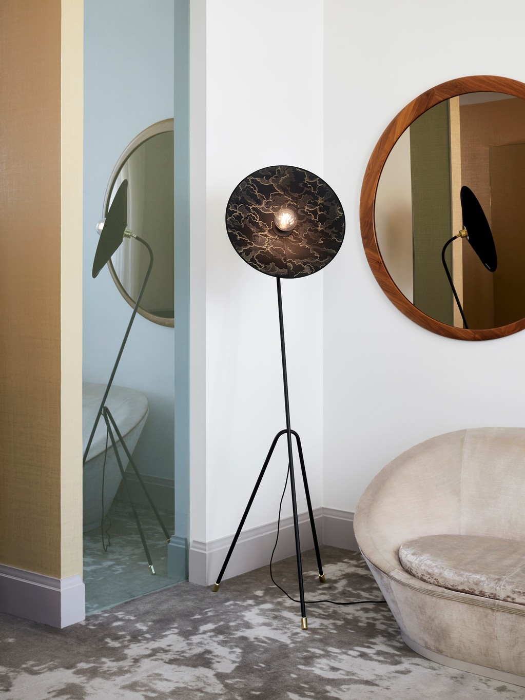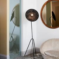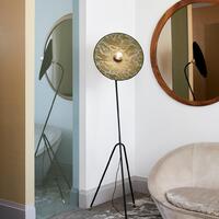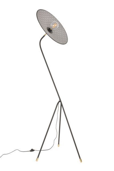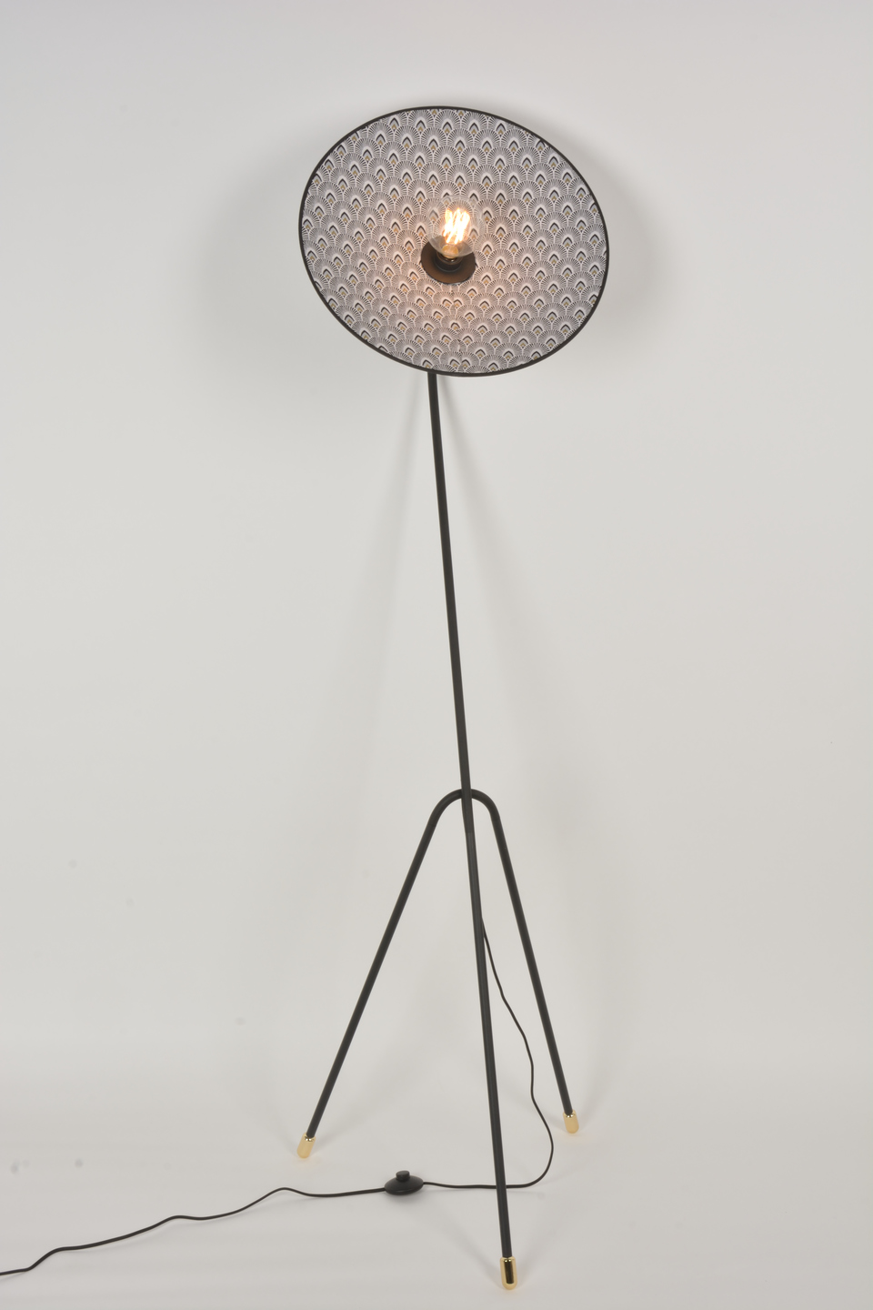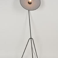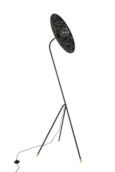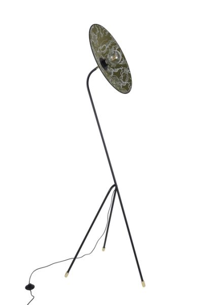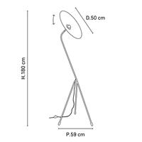 Podesiva podna svjetiljka u obliku tronošca. Stalak od lakiranog metala sa pjeskarenim završetkom i mesinganim detaljima. Konusni abažur od dva materijala. Opremljena tekstilnim strujnim kablom i nožnim prekidačem.