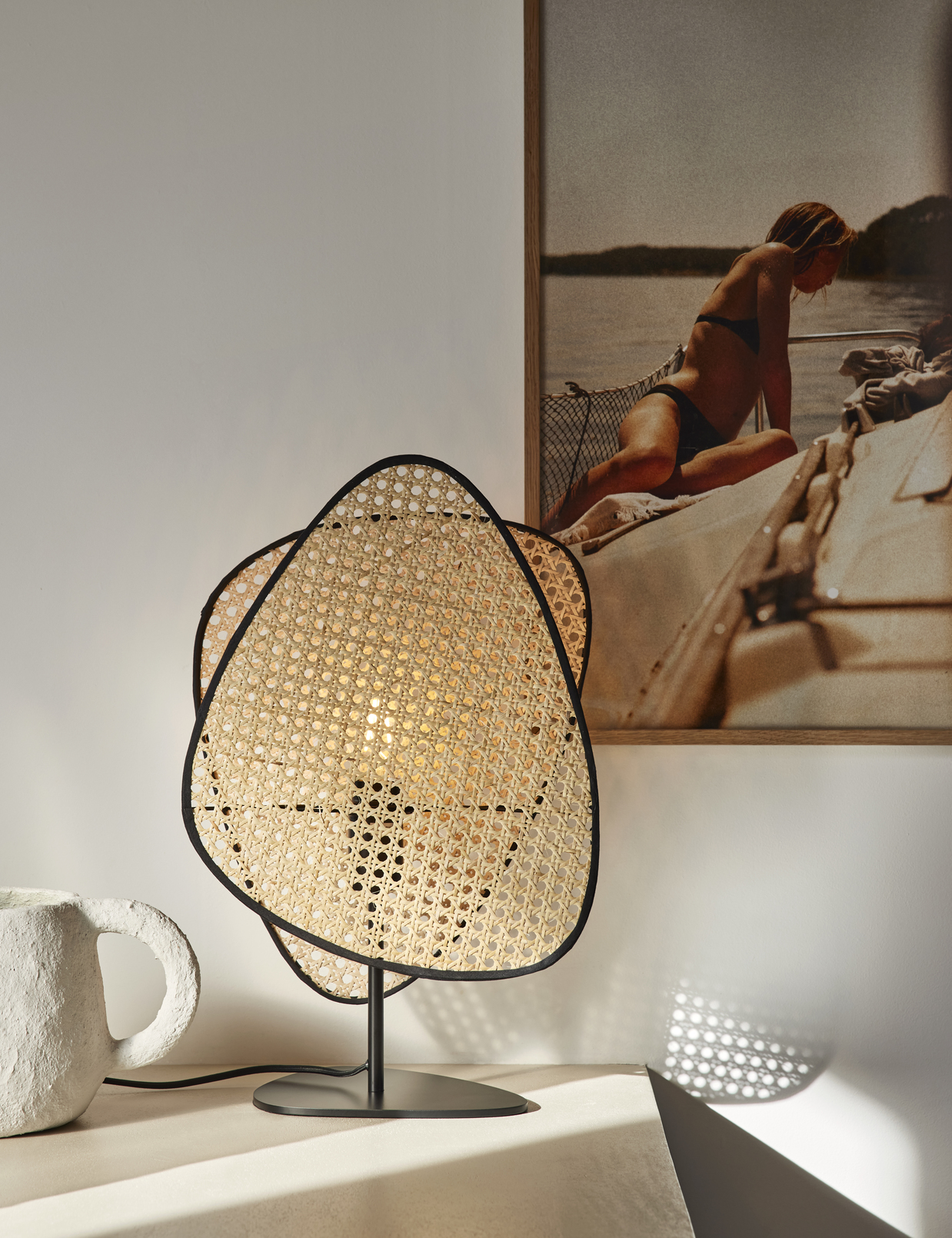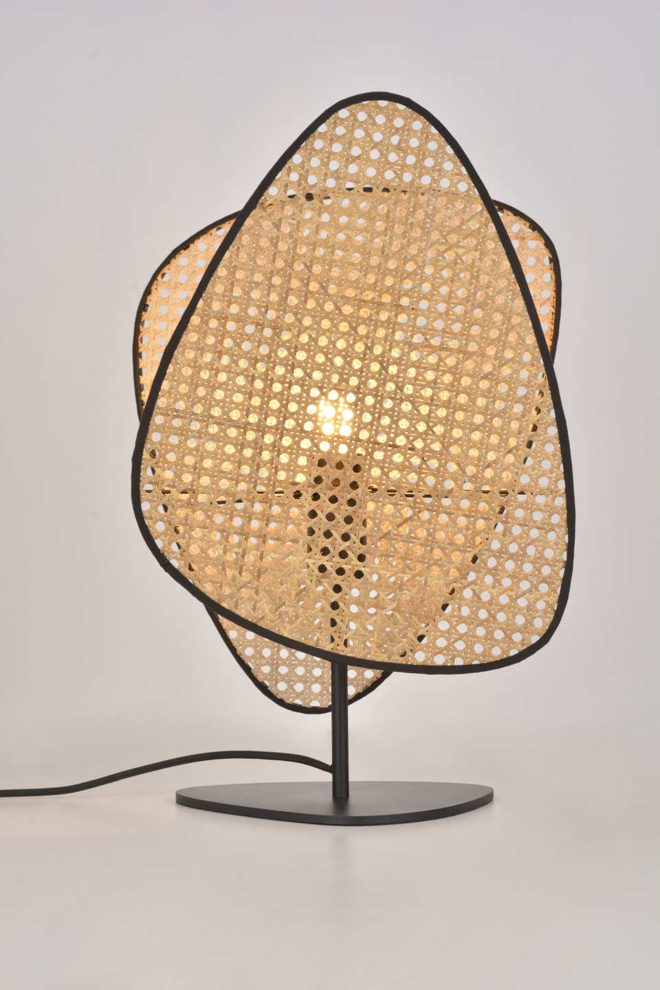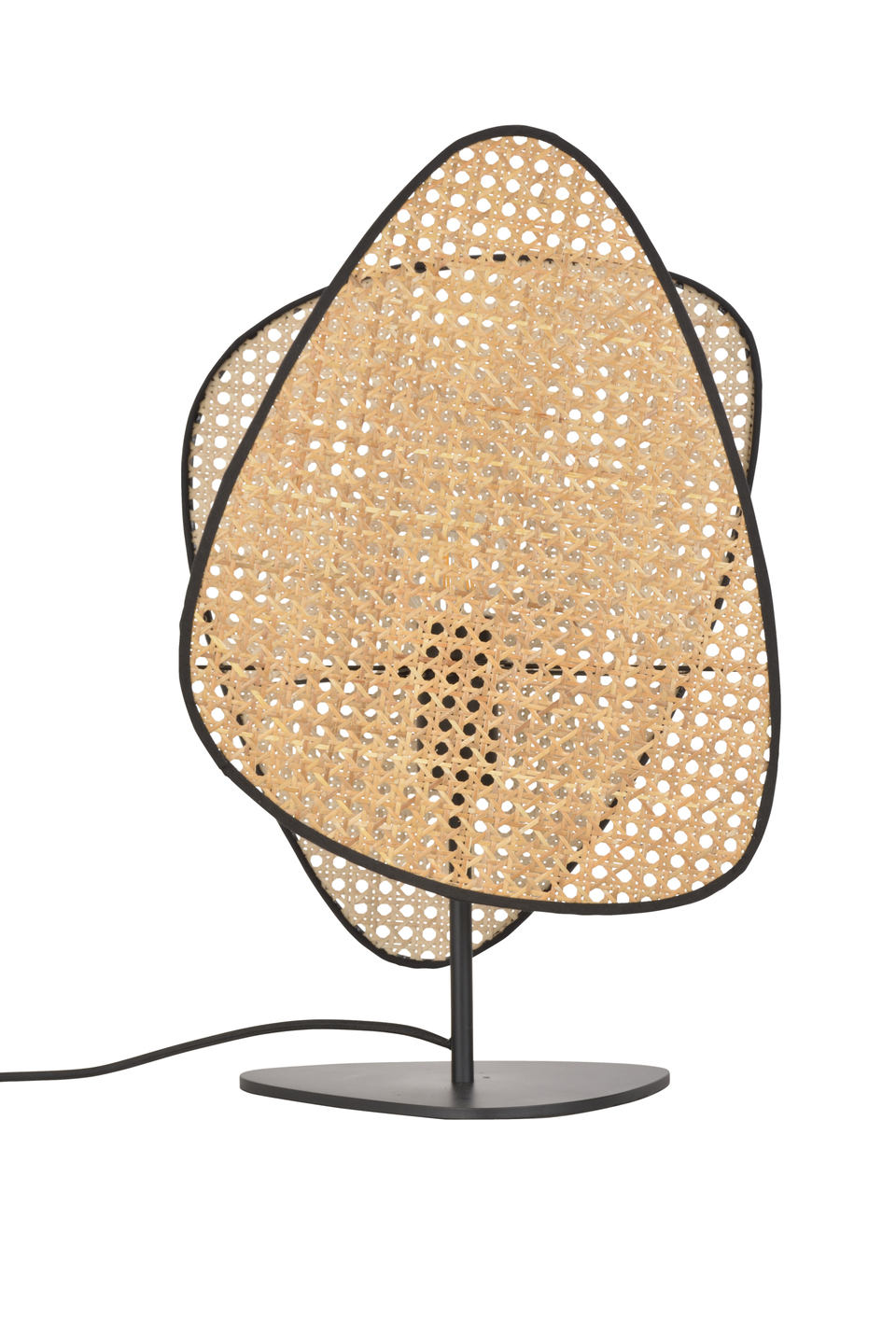 Stolna lampa s postoljem od obojenog metala. Abažur sastavljen od 2 pletena sjenila u natur boji.Boja: natur.