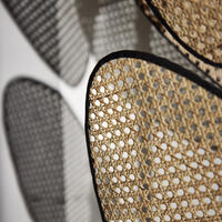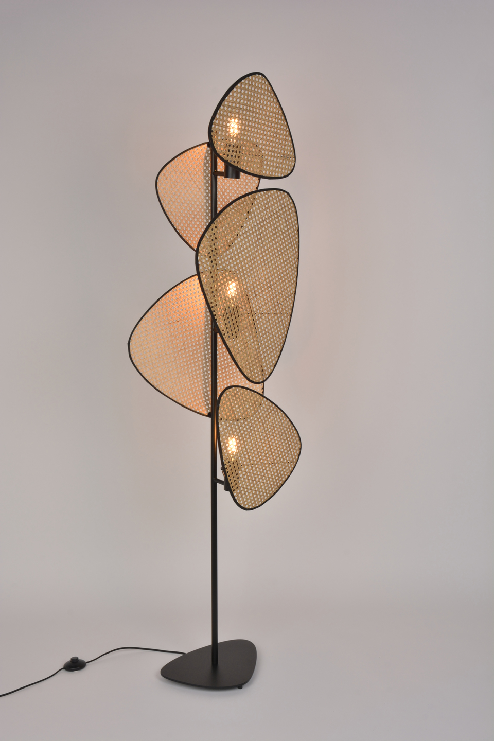 Podna lampa s 3 svjetla i postoljem od obojenog metala. Abažur sastavljen od 5 pletenih sjenila.Boja: natur.