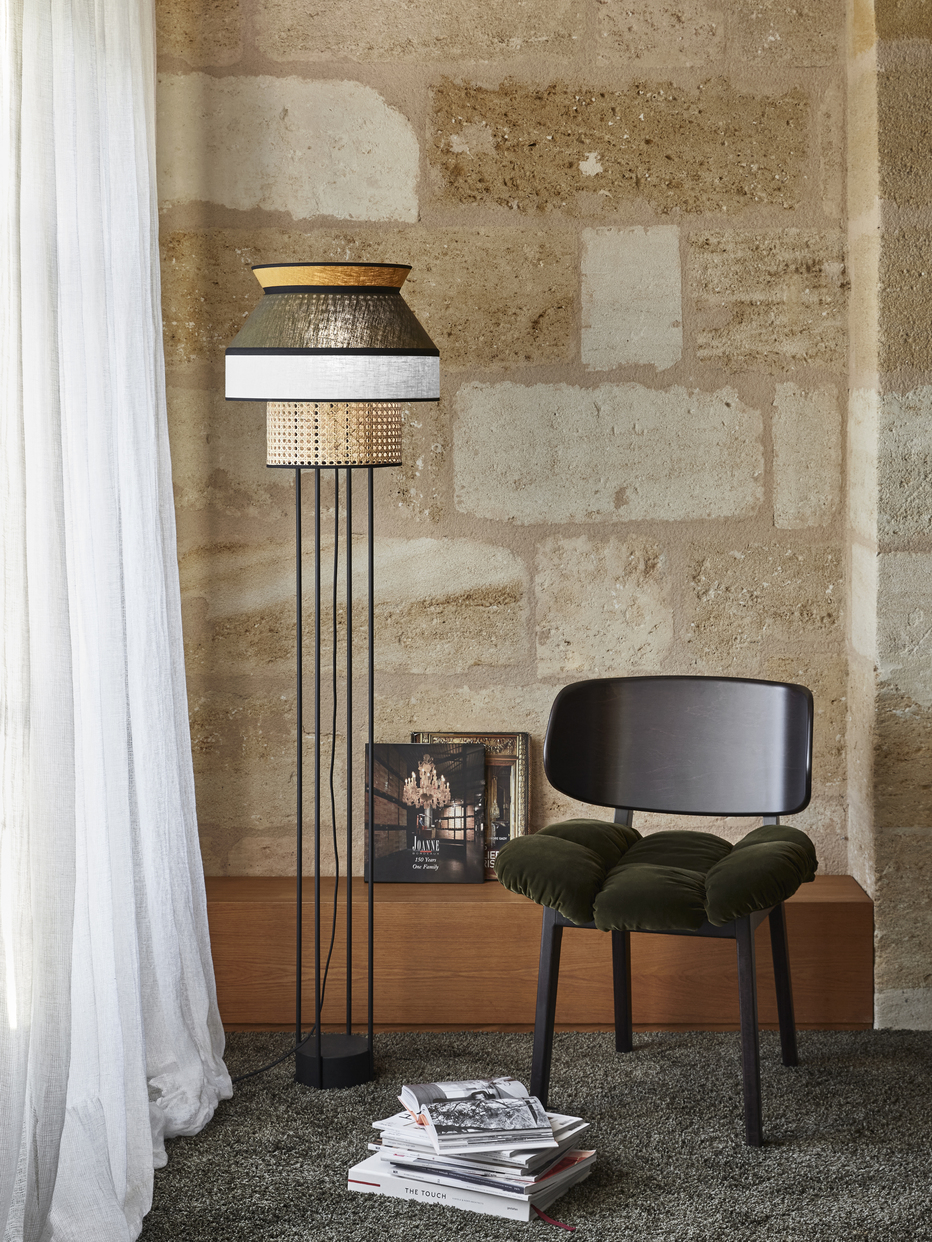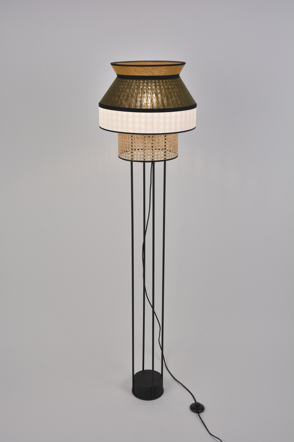 Podna svjetiljka od pjeskarenog i obojenog metala. Abažur pleteni i od platna. Strujni kabel od tekstila i nožni prekidač.Boje: bijela/kaki/curry.