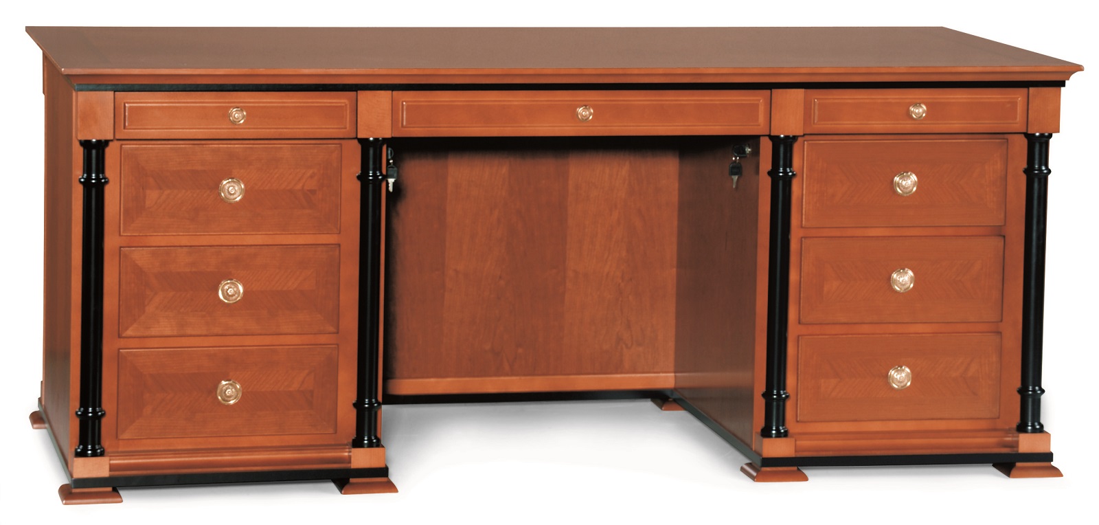 Masivno drvo. Furnir trešnje. Površine tretirane sa poliuretanskim lakom. Crno bojani detalji. Blum® vodilice.